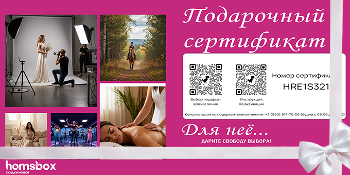 Подарок‑впечатление — это возможность подарить близкому человеку свободу выбора среди множества вдохновляющих активностей: от умиротворяющих SPA‑процедур до захватывающих спортивных приключений. Вы дарите не вещь, а шанс создать своё идеальное воспоминание — то, что действительно принесёт радость и останется в сердце навсегда. Каждый выбор — это новая история, которая оживёт благодаря Вашему подарку. - В категорию подарок-впечатление «Для неё» 2000 р. входят следующие сертификаты на выбор: